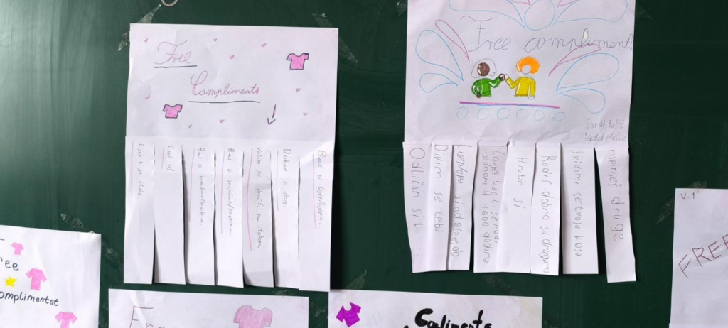 Učenici odjeljenja V3 danas su na poseban i kreativan način obilježili Dan ružičastih majica. Tim povodom izradili su poruke s pozitivnim i lijepim komplimentima, koje su tokom velikog odmora podijelili učenicima škole.