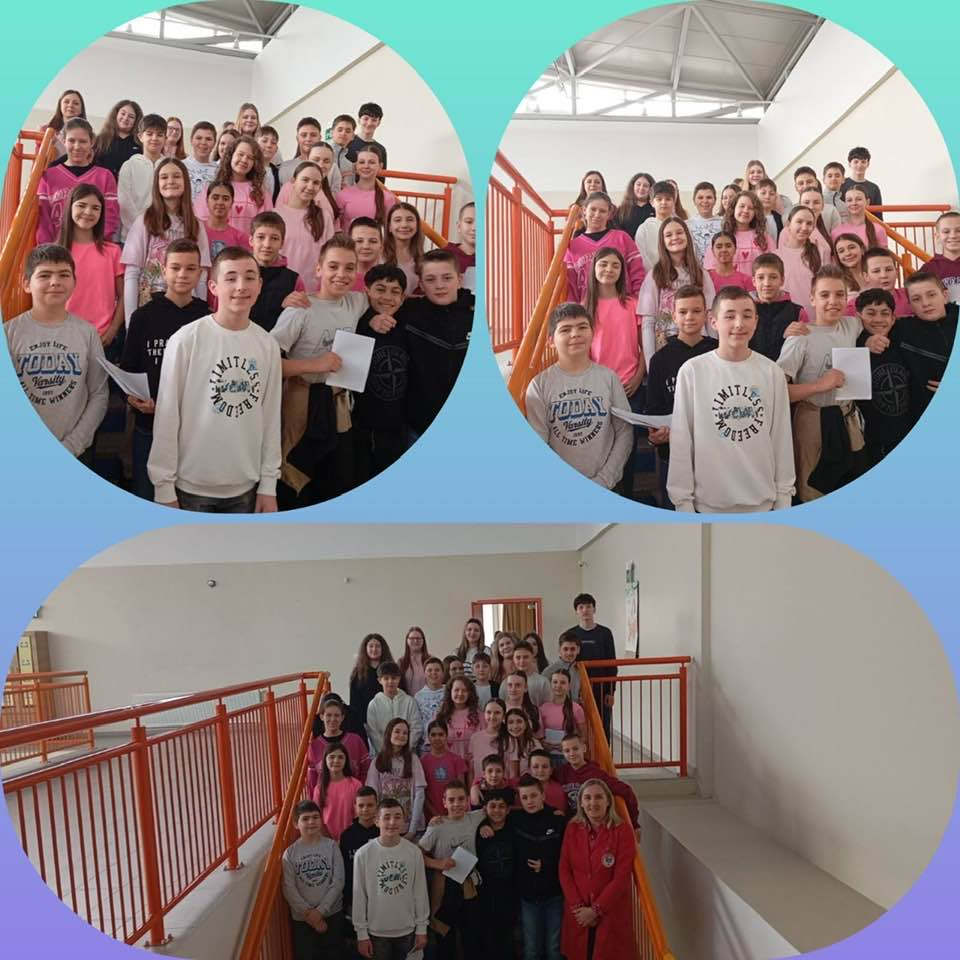 Povodom Dana ružičastih majica, učenici VII-1 i VII-2 odjeljenja su pripremili prigodan tekst i kratki scenarij kojim su na poseban način obilježili ovaj važan dan. Svoj program su predstavili svim razredima, obilazeći učionicu po učionicu i prenoseći snažnu poruku o važnosti tolerancije, poštovanja i nenasilja. Njihov trud, kreativnost i angažman doprinijeli su podizanju svijesti o vršnjačkom nasilju i značaju međusobnog uvažavanja u školskoj zajednici.