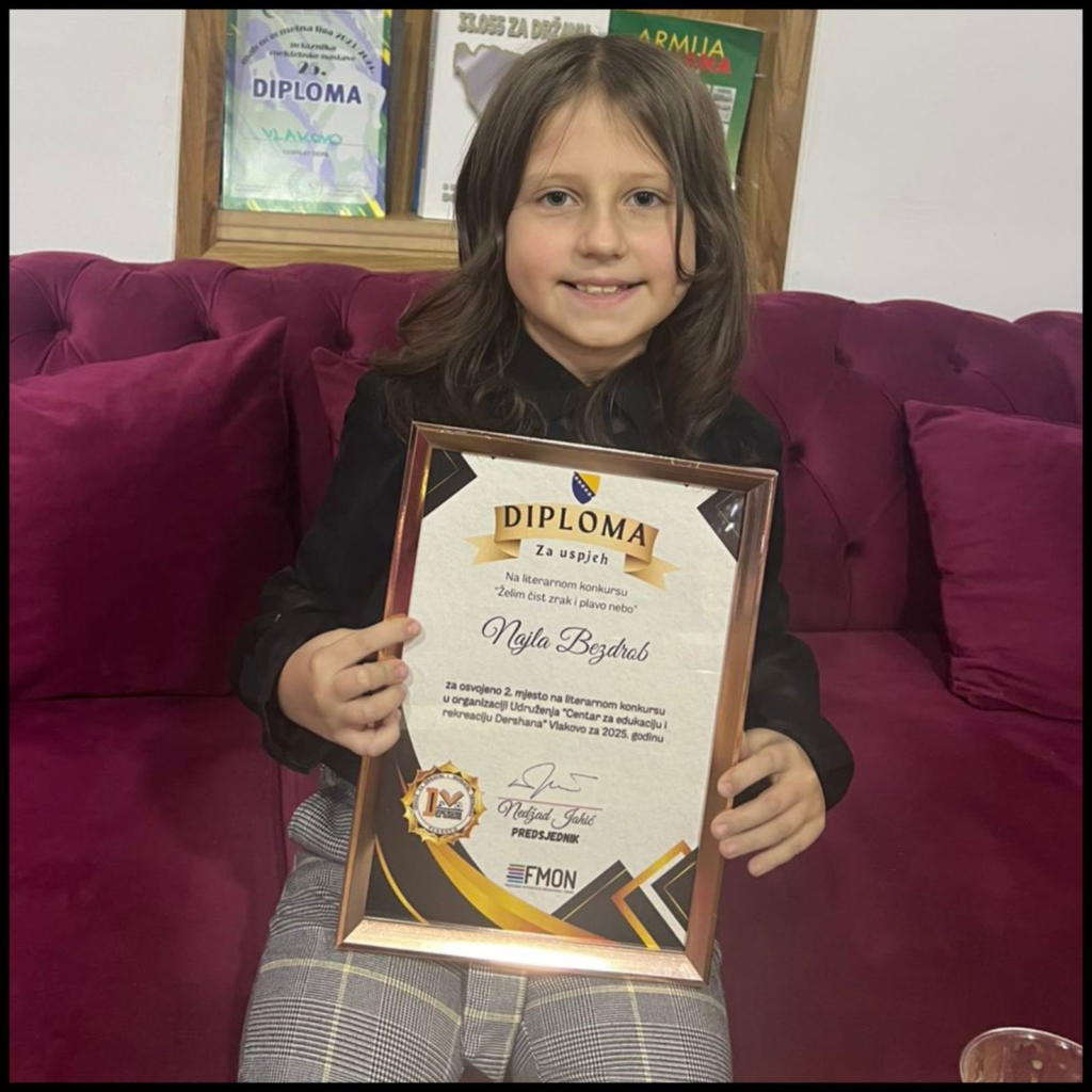 Naša učenica, Najla Bezdrob, iz IV-1 odjeljenja osvojila je 2. mjesto na literarnom konkursu „Želim čist zrak i plavo nebo“, koji je organizovalo Udruženje „Dershana“, uz podršku Federalnog ministarstva obrazovanja i nauke.