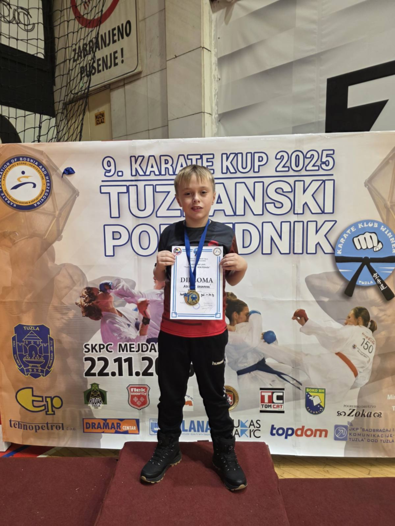 Na međunarodnom turniru 9. Karate kup “Tuzlanski pobjednik”, na kojem je učestvovao veliki broj takmičara iz više klubova, naš Adijan, učenik odjeljenja IV-2, ostvario je izvanredan rezultat i zasluženo osvojio zlatnu medalju u svojoj kategoriji.